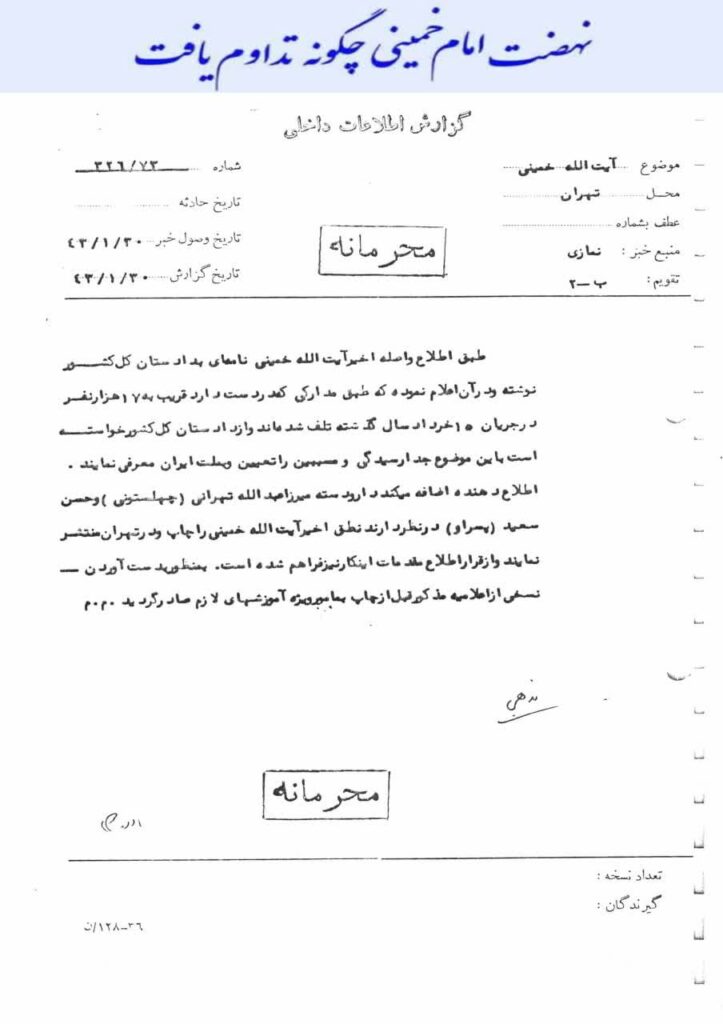 اطلاع‌دهنده اضافه می‌کند داروسته میرزا عبدالله تهرانی (چهلستونی) و حسن سعید (پسراو) در نظر دارند نطق اخیر آیت الله خمینی را چاپ و در تهران منتشر نمایند و از قرار اطلاع مقدمات اینکار نیز فراهم شده است. به منظور بدست آوردن نسخی از اعلامیه مذکور قبل از چاپ به مامور ویژه آموزش‌های لازم صادر گردید.