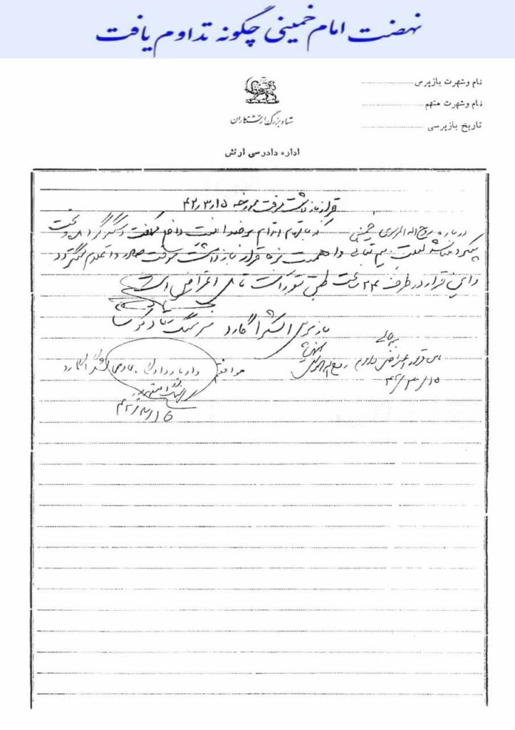 🔺درباره روحاله الموسوی خمینی که باتهام اقدام برضد امنیت داخلی مملکت دستگیر گردیده و تحت پیگردمیباشد بعلت بیم تبانی و اهمیت بزه قرا بازداشت موقت صادر و اعلام میگردد و این قرار در ظرف ۲۴ ساعت طبق مقررات قابل اعتراض است