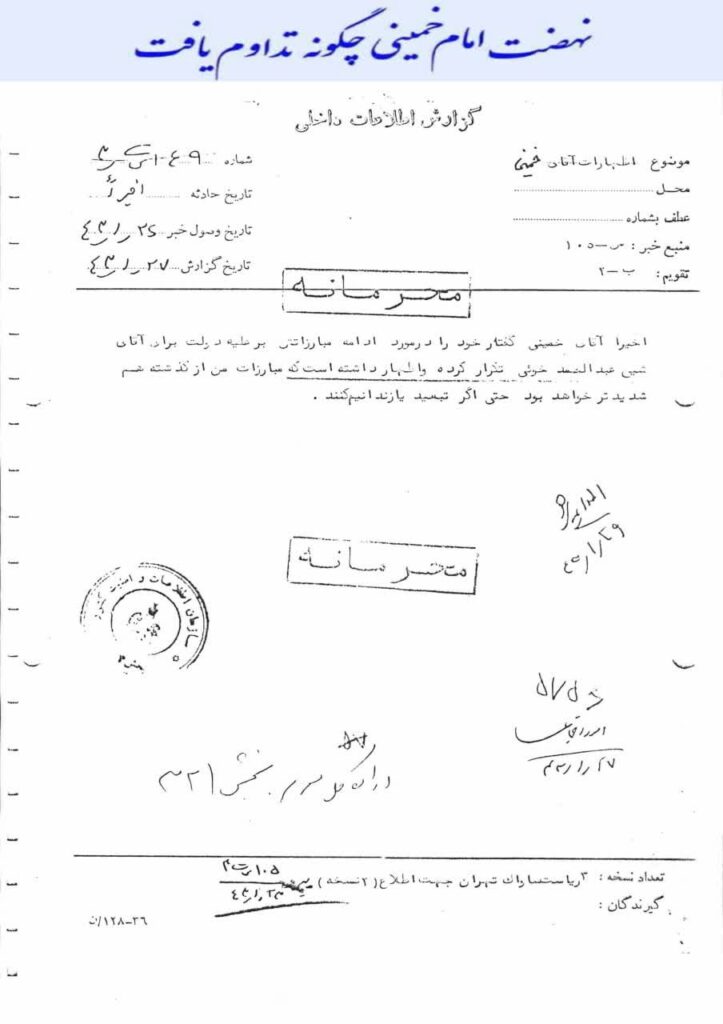 📍اخیرا آقای خمینی گفتار خود را در مورد ادامه مبارزاتش برعلیه دولت برای آقای شیخ عبدالصمد خوئی تکرار کرده و اظهار داشته است که مبارزات من از گذشته هم شدیدتر خواهد بود حتی اگر تبعید یا زندانیم کنند.