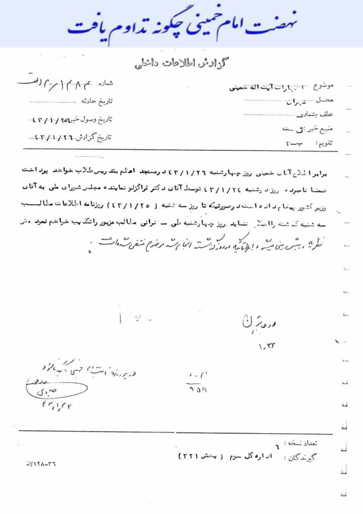 برابر اطلاع آقای خمینی روز چهارشنبه ۴۳/۱/۲۶ در مسجد اعظم بتدریس طلاب خواهد پرداخت ضمنا نامبرده روز دوشنبه ۴۳/۱/۲۴ توسط آقای دکتر قراگزلو نماینده مجلس شورای ملی به آقای وزیر کشور پیغام داده است در صورتیکه تا روز سه شنبه ( ۴۳/۱/۲۵ ) روزنامه اطلاعات مطالب سه شنبه گذشته را اصلاح ننماید روز چهارشنبه طی سخنرانی مطالب مزبور را تکذیب خواهم نمود.