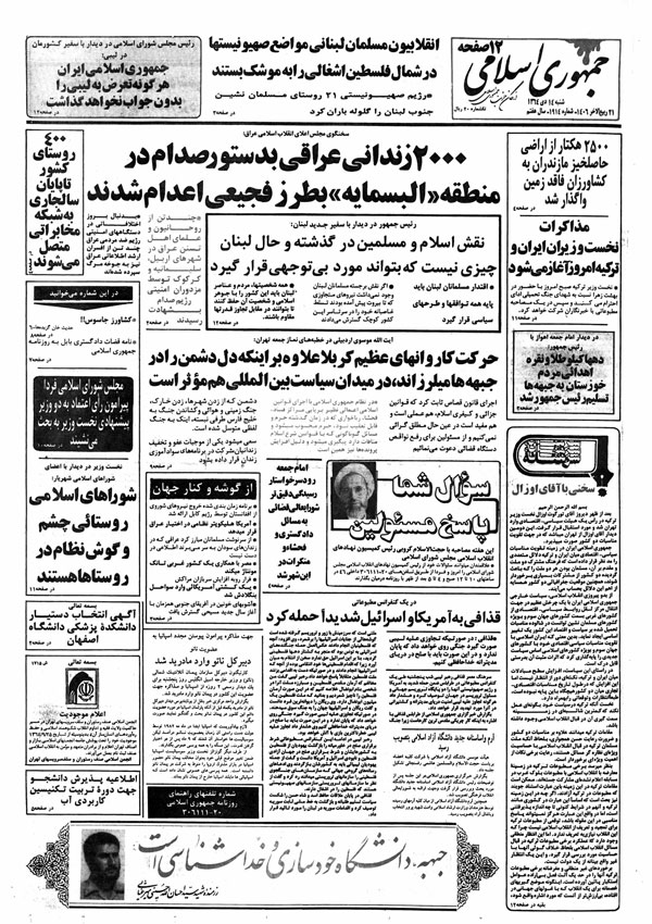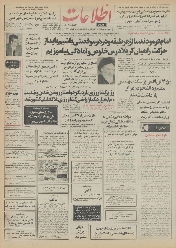 تصویر روزنامه اطلاعات تصویر روزنامه کیهان Upload Image... تصویر روزنامه جمهوری اسلامی مطالب مرتبط: چهل سال پیش در چنین روزی: ا دی 1364 چهل سال پیش در چنین روزی: 2 دی 1364 چهل سال پیش در چنین روزی: 3 دی 1364 چهل سال پیش در چنین روزی: 4 دی 1364