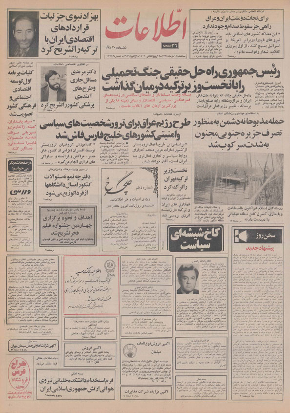تصویر روزنامه اطلاعات تصویر روزنامه کیهان Upload Image... تصویر روزنامه جمهوری اسلامی مطالب مرتبط: چهل سال پیش در چنین روزی: ا دی 1364 چهل سال پیش در چنین روزی: 2 دی 1364 چهل سال پیش در چنین روزی: 3 دی 1364 چهل سال پیش در چنین روزی: 4 دی 1364