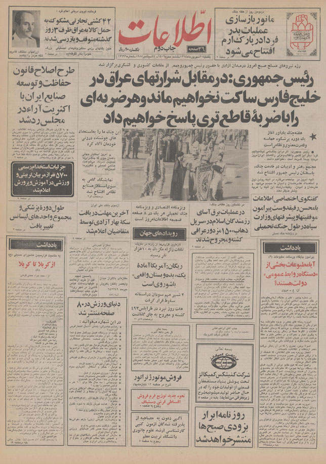 تصویر روزنامه اطلاعات تصویر روزنامه کیهان Upload Image... تصویر روزنامه جمهوری اسلامی Upload Image... مطالب مرتبط: چهل سال پیش در چنین روزی: 2 شهریور 1364 چهل سال پیش در چنین روزی: 3 شهریور 1364 چهل سال پیش در چنین روزی: 4 شهریور 1364 چهل سال پیش در چنین روزی: 6 شهریور 1364